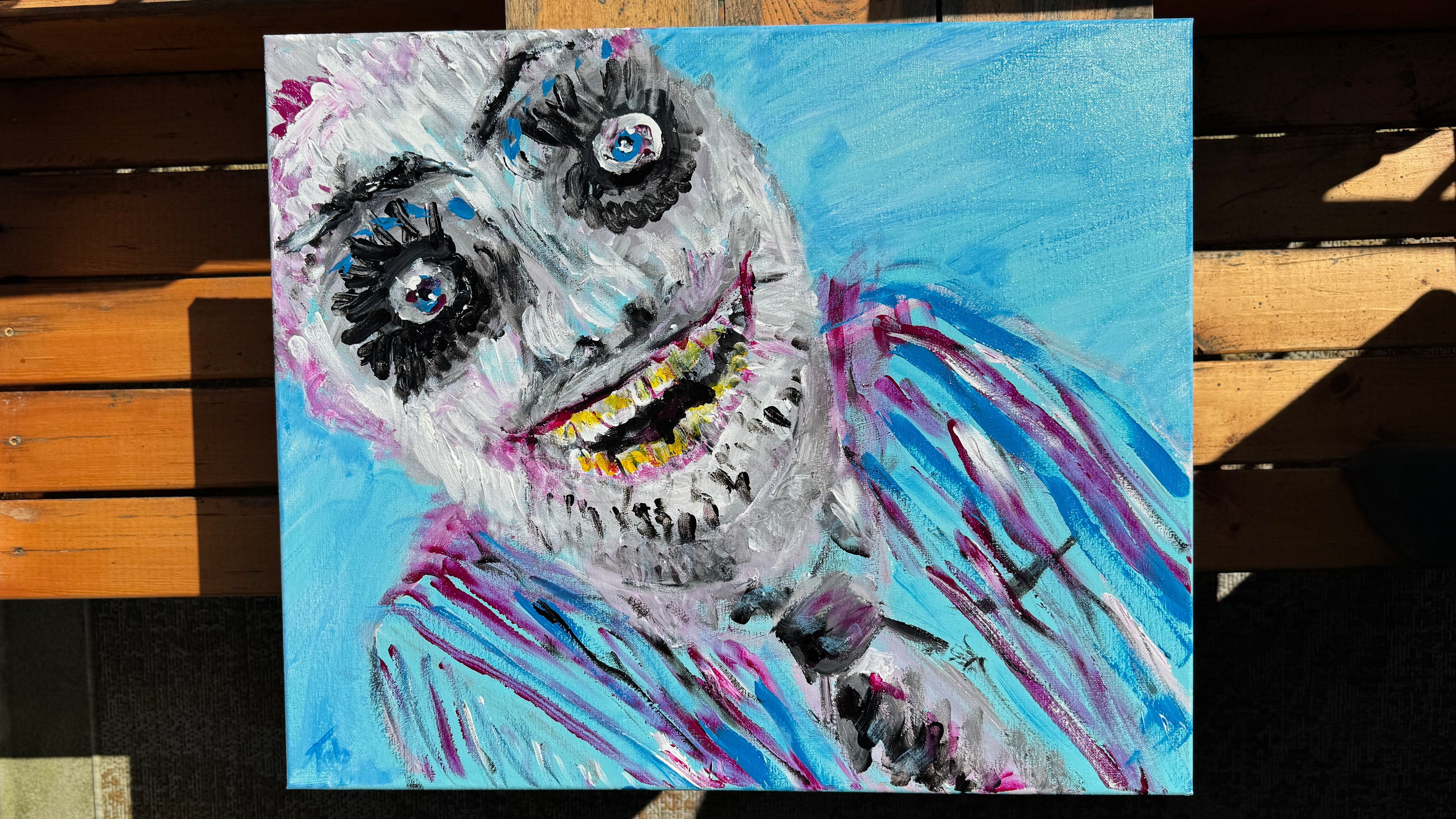 Bootstraps the Clown, mixed media on stretched canvas panel